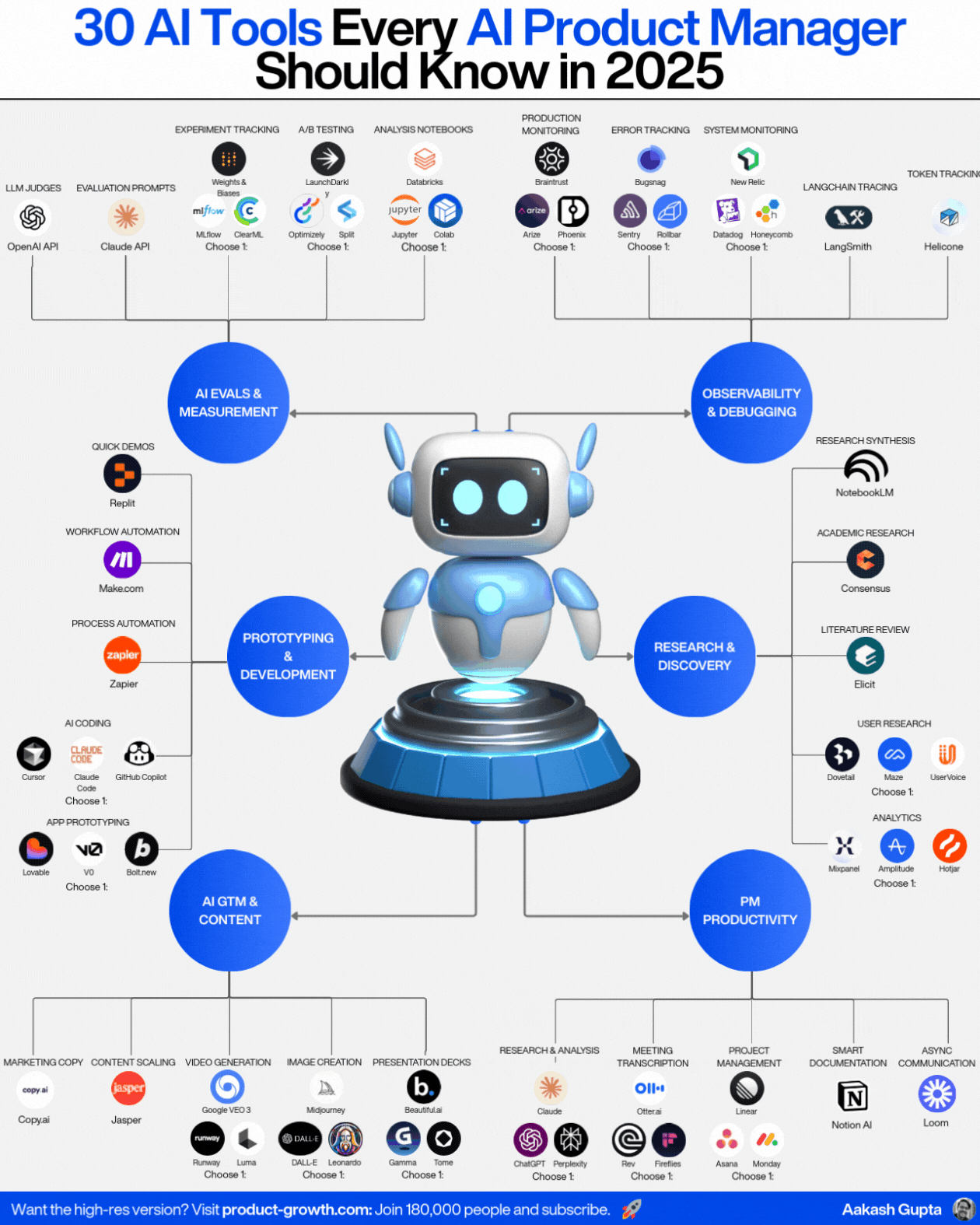This comprehensive AI tools guide for product managers covers everything from AI evaluation and monitoring to content creation and prototyping. Master these 30 AI tools to become a more effective product manager in 2025.