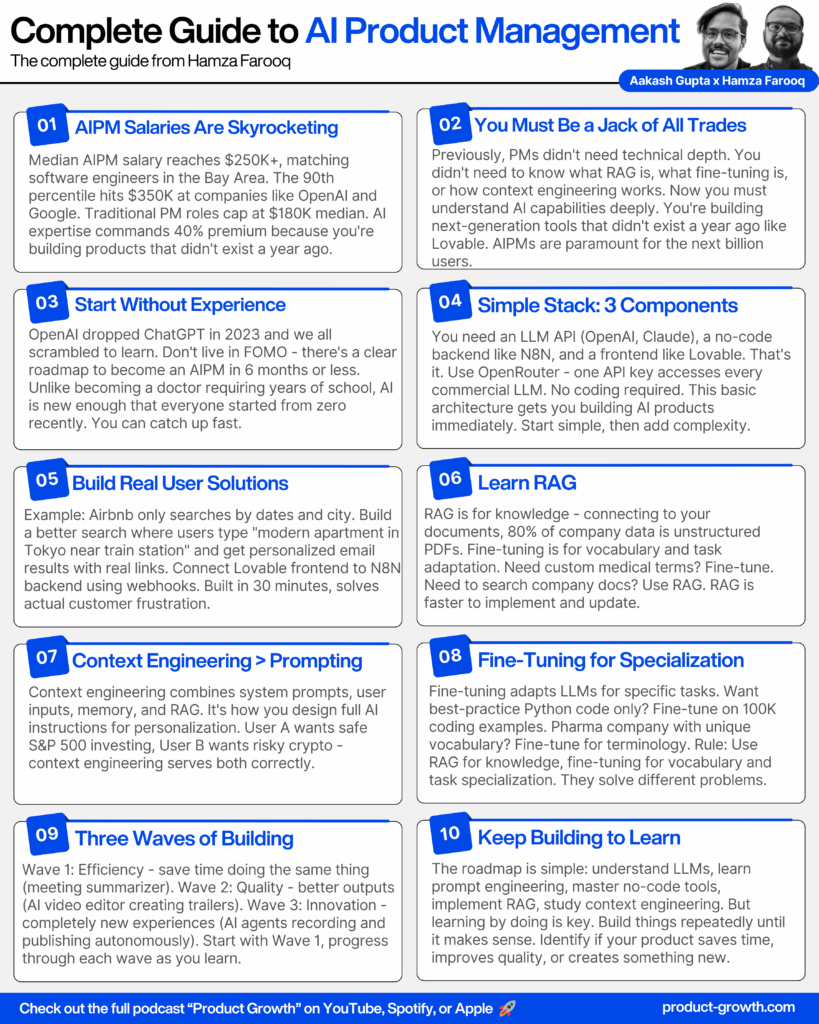 This conversation with Hamza Farooq reveals the transformative power of AI product management and the realistic pathway to breaking into this high-paying field. With median salaries now matching software engineers in the Bay Area, AIPM represents one of the most lucrative career pivots available today.