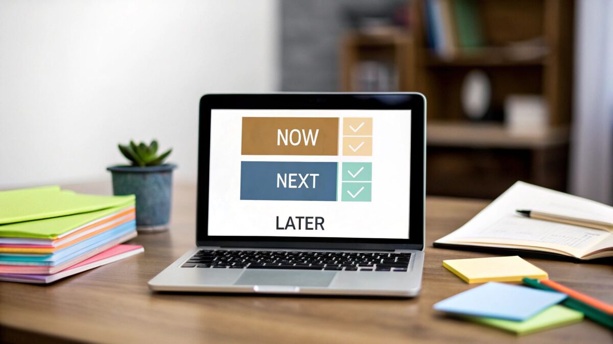 A Now-Next-Later roadmap is a powerful way to show your product's direction without getting boxed into rigid, brittle timelines. It boils everything down to three simple columns: Now (what the team is actively building), Next (what's queued up), and Later (ideas bubbling for the future). It’s perfect for any team that needs to stay agile […]